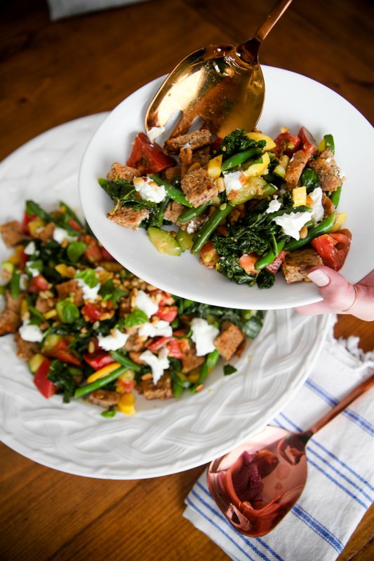 This recipe is a KERF tackle a wholesome panzanella, which implies “bread salad” in Italian! It brings entire wheat bread, kale, squash, inexperienced beans, tomatoes and goat cheese collectively into a colourful, hearty salad. The goat cheese makes it!