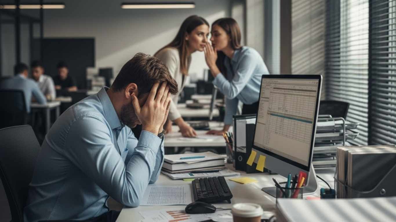 Employee observing a coworker showing negative body language and whispering, symbolizing recognizing toxic coworkers before they affect team morale.